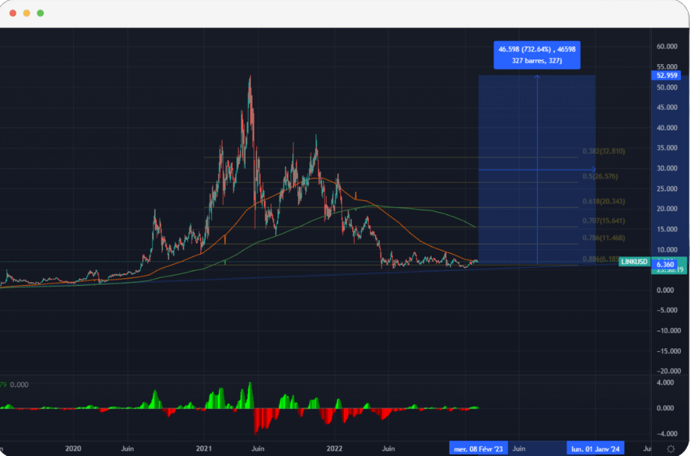 LINK se trade actuellement à un peu moins de 7$. Un retour à son ATH depuis ce niveau entraînerait une hausse d’environ 730%.
