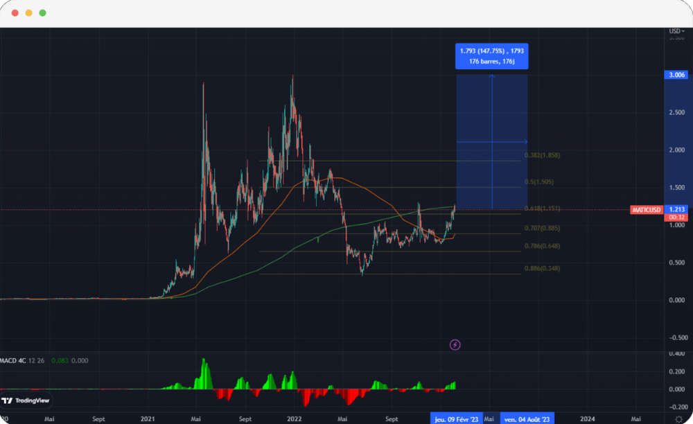 La cryptomonnaie prometteuse MATIC s’échange actuellement à 1.2$. Une hausse jusqu’à son ATH serait d’environ 150% depuis le prix actuel.