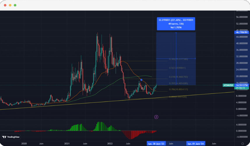 ATOM s’échange actuellement à une valeur de 15$ par token. En supposant que le cours d’ATOM rejoigne son ATH (All Time High), on compterait une croissance d’environ 220%.