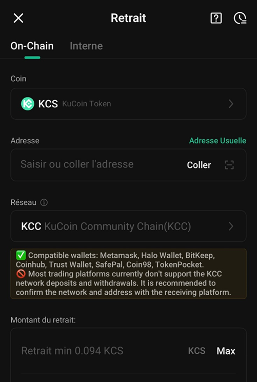 Achetez ensuite 10 € de KCS sur KuCoinpour couvrir les frais de transaction. Transférez vos KCS sur Metamask en veillant à les envoyer sur le réseau KCC. Une fois reçus, rendez-vous sur le site de KuScription.
